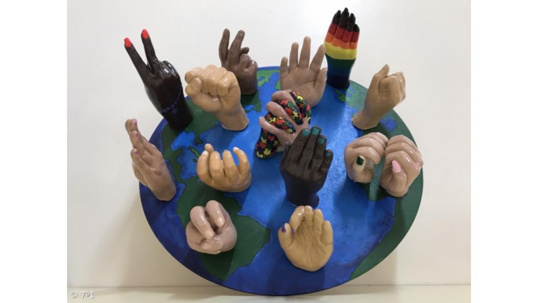 "O pensamento de criarmos várias mãos foi imediato e de uma forma geral em toda a turma. Assim juntamente com a professora fomos pesquisar formas e materiais para as conseguirmos construir. A solução passou por um material usado muito pelos médicos dentistas que se chama "alginato". Elaborámos um projeto, desenhámos e pintámos as mãos e o fundo onde iriam estar essas mãos. Resumidamente, misturámos o alginato com água de forma a ficar uma massa líquida, colocámos num recipiente e inserimos a mão com a posição que pretendíamos. O alginato seca em 2 minutos e aí retirámos as mãos. Depois misturámos gesso em pó com água, mexemos bem e vertemos para dentro dos moldes de alginato. A hora de retirar o alginato foi muito intensa, estávamos todos a torcer que desse certo. Foi muito divertido o processo de as criar, pois enquanto o alginato seca tínhamos de estar imóveis e foi um desafio. Alguns de nós temos as mãos muito grandes, então, arranjar um recipiente onde elas coubessem foi outra aventura. Estávamos ansiosos para ver o resultado. Mas gostámos muito do que vimos, pois notam-se todos os pormenores (impressões digitais, cicatrizes, unhas, etc.). Com a ajuda da professora experimentámos, com guaches fazer várias tonalidades de pele. Pintámos as nossas mãos conforme pensámos. Num círculo de madeira, desenhámos o mundo e pintámo-lo. Por fim colámos as mãos no mundo. Achamos que o significado deste trabalho, é que que apesar da cor, raça, ou sexualidade pertencemos todos ao mesmo mundo. Devemos respeitar e não discriminar os outros só por serem diferentes, ou seja, o nosso trabalho representa a igualdade e a inclusão social.