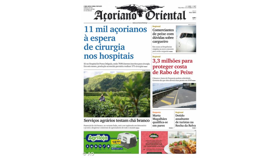 Na capa de hoje, destaque ainda para as dúvidas sobre o concurso para o avião cargueiro por parte dos exportadores de peixe e para o projeto de proteção da orla costeira em Rabo de Peixe, apresentado ontem, cujas obras o governo regional pretende ver concluídas em 2018.