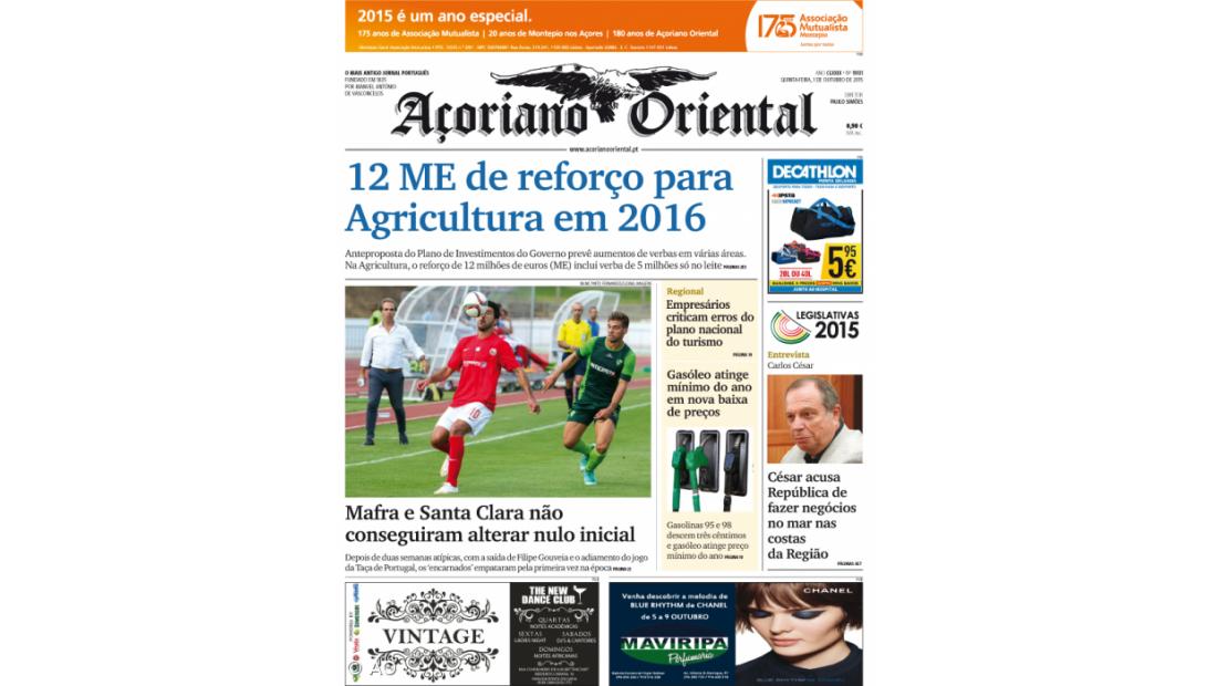 "Empresários criticam erros do plano nacional do turismo" e "Gasóleo atinge mínimo do ano em nova baixa de preços" são outros títulos do Açoriano Oriental de quinta-feira, 1 de outubro de 2015.