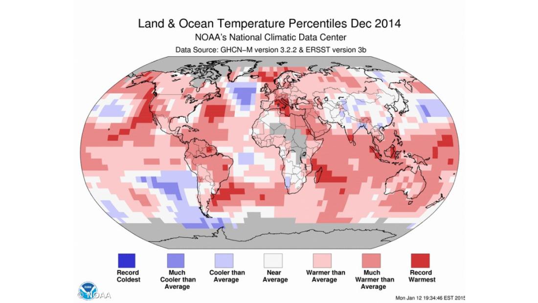 A temperatura nos oceanos foi 0,57ºC superior à média dos anteriores 134 anos, entre 1880 e 2014, batendo os anteriores recordes de 1998 e 2003 de 0,05ºC.