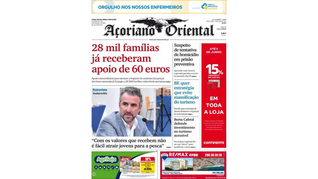 "28 mil famílias já receberam apoio de 60 euros" é a manchete do Açoriano Oriental