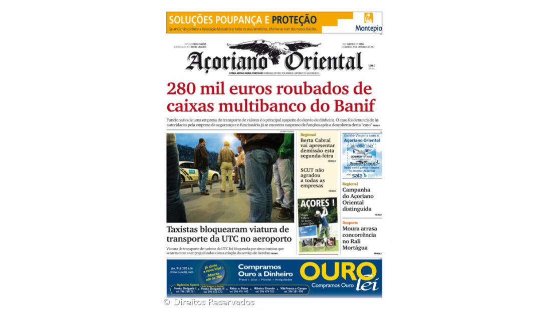 "280 mil euros roubados de caixas multibanco do Banif" é a manchete do Açoriano Oriental