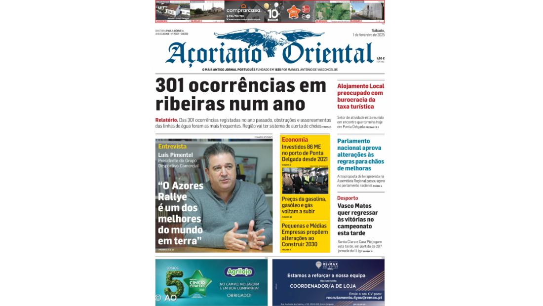 A divulgação do relatório das ocorrências em ribeiras nos Açores em 2024 está em destaque no Açoriano Oriental de sábado, 1 de fevereiro de 2025.