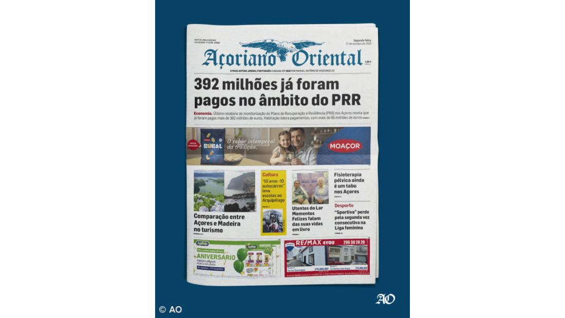 "392 milhões já foram pagos no âmbito do PRR" é a manchete do Açoriano Oriental