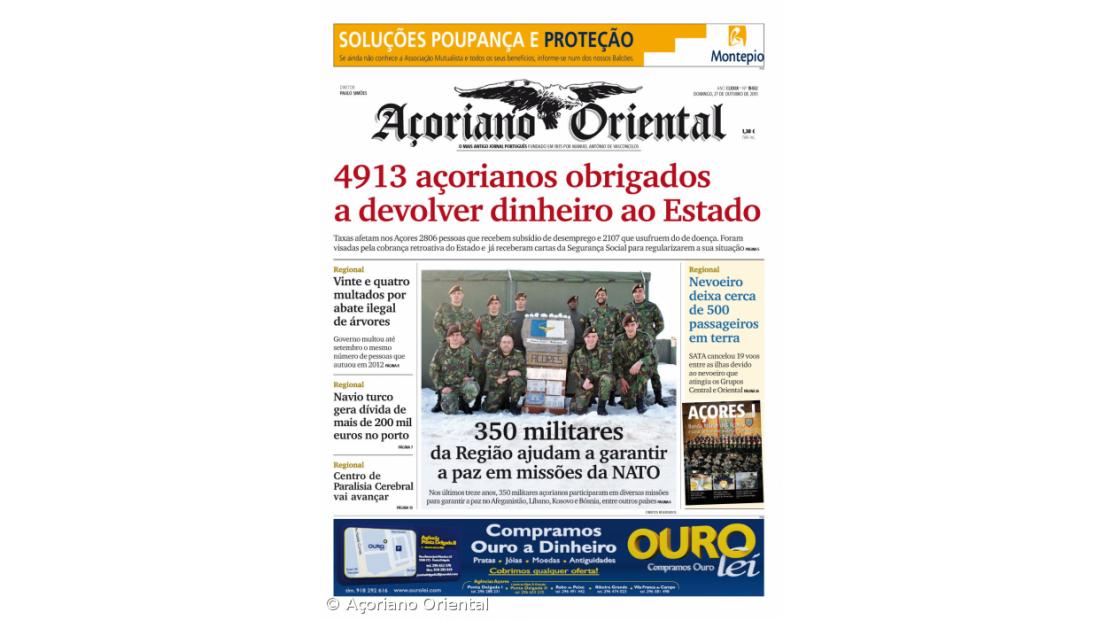 A primeira página faz destaque fotográfico com a participação de 350 militares açorianos em diversas missões internacionais no estrangeiro com o objetivo de garantir a paz. "Nevoeiro deixa cerca de 500 passageiros em terra", "Vinte e quatro multados por abate ilegal de árvores", "Navio turco gera dívida de mais de 200 mil euros no porto" e "Centro de Paralisia Cerebral vai avançar" são os outros títulos do Açoriano Oriental.