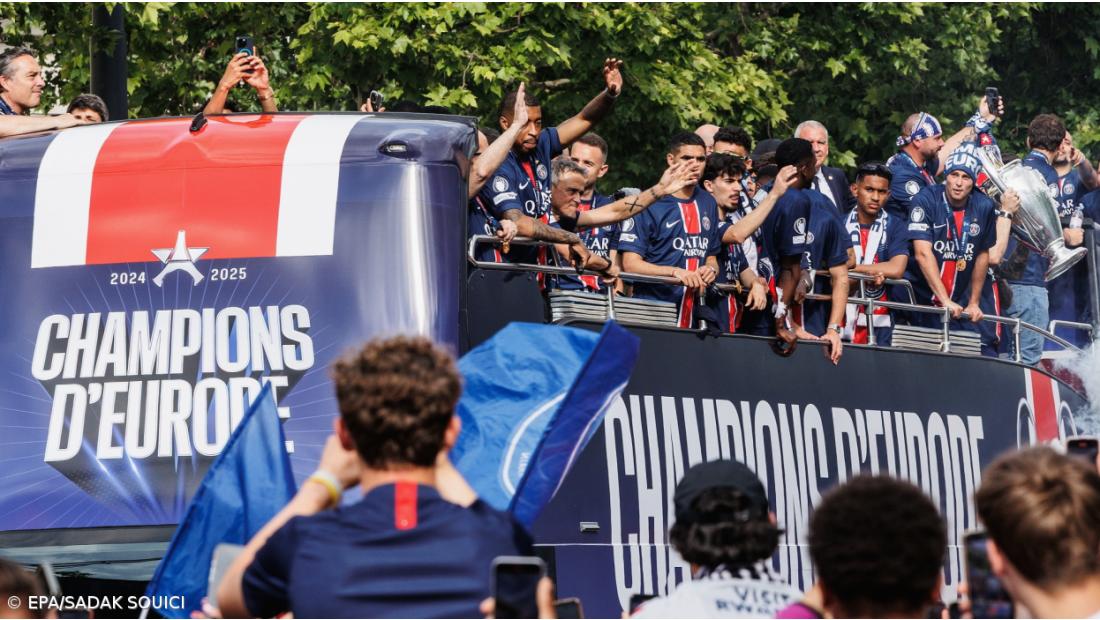 Após o triunfo em Munique, no sábado, o plantel do PSG, com os portugueses Nuno Mendes, Vitinha, João Neves e Gonçalo Ramos, foi recebido em festa, com um desfile nos Campos Elísios com mais de 100 mil pessoas.