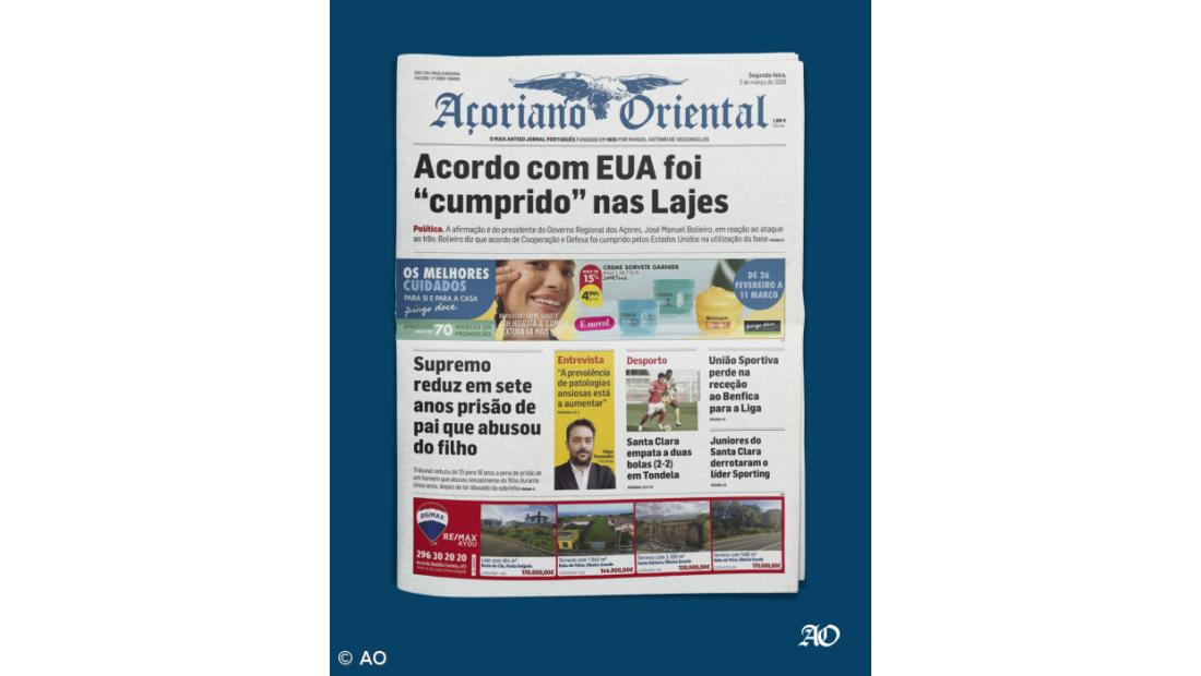 A declaração do presidente do Governo Regional dos Açores sobre o ataque ao Irão e a utilização da Base das Lajes está em destaque no Açoriano Oriental de segunda-feira, 2 de março de 2026.