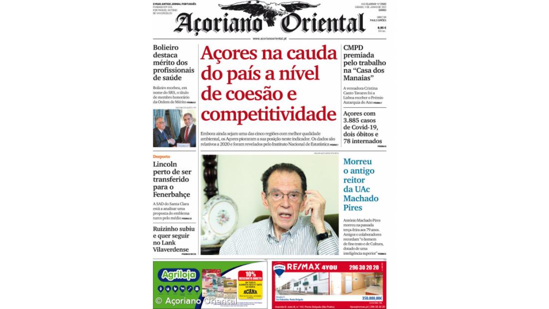 "Morreu o antigo reitor da UAc Machado Pires" é o título da manchete fotográfica. "CMPD premiada pelo trabalho na 'Casa dos Manaias'", "Açores com 3.885 casos de Covid-19, dois óbitos e 78 internados", "Bolieiro destaca mérito dos profissionais de saúde", "Lincoln perto de ser transferido para o Fenerbahçe" e "Ruizinho subiu e quer seguir no Lank Vilaverdense" são os restantes títulos de capa do Açoriano Oriental.