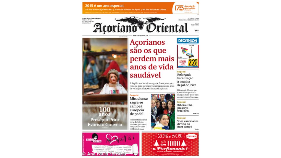 100 anos do Presépio Prior Evaristo Gouveia, é o grande destaque de foto. O matutino chama ainda à capa que a micaelense Helena Medeiros sagra-se campeã europeia de padel; Reforçada fiscalização à apanha ilegal de leiva e Voos cancelados devido ao mau tempo