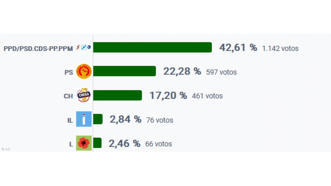 O resultado final da votação dá 42,61% dos votos para a AD; o PS obteve 22,28% e o Chega 17,20%;