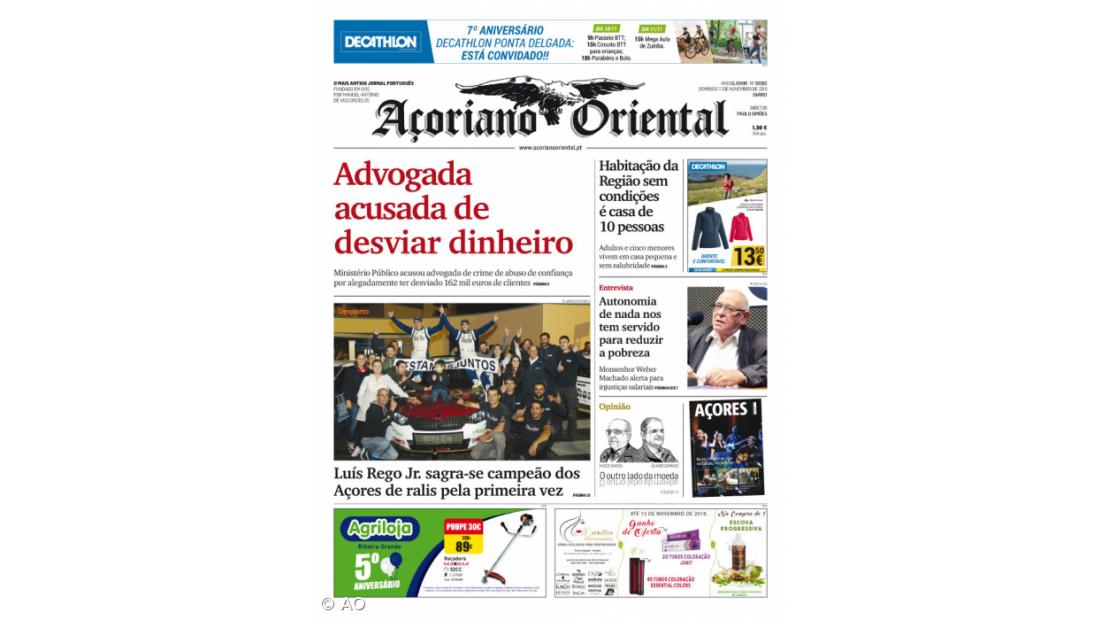 A conquista de Luís Rego Jr. do título de campeão dos Açores de ralis pela primeira vez é o tema de destaque do Desporto na primeira página.
