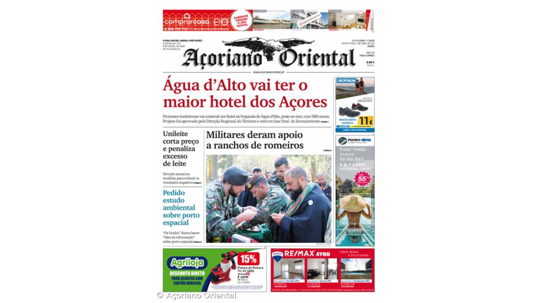 "Militares deram apoio a ranchos de romeiros" é o título da manchete fotográfica. "Unileite corta preço e penaliza excesso de leite" e "Pedido estudo ambiental sobre porto espacial" são os restantes títulos de capa do Açoriano Oriental.