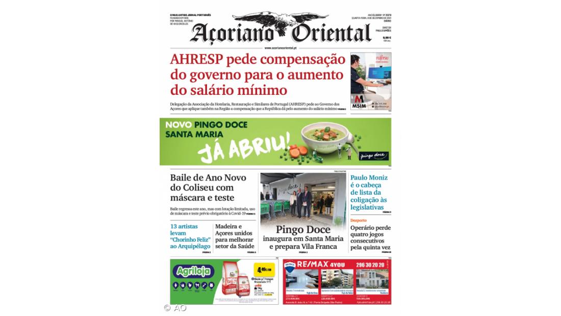 A delegação dos Açores da Associação da Hotelaria, Restauração e Similares de Portugal (AHRESP) reclama que também na Região se aplique o apoio que o Governo da República está a dar às empresas para o aumento do salário mínimo. O assunto está em destaque no Açoriano Oriental de quarta-feira, 8 de dezembro de 2021.