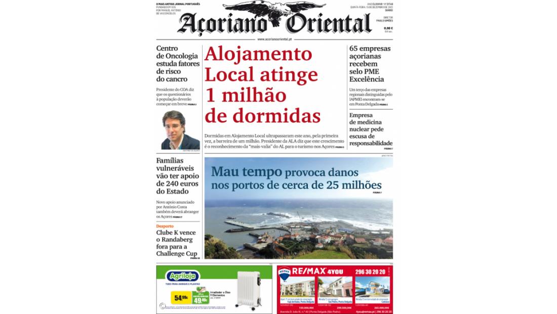 A primeira página do jornal de hoje também destaca "Centro de Oncologia estuda fatores de risco do cancro" e "Famílias vulneráveis vão ter apoio de 240 euros do Estado".