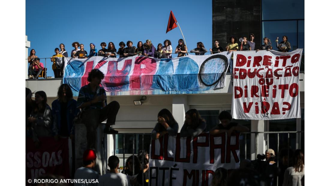Durante o protesto na escola António Arroio, um grupo de cerca de 20 alunos ativistas subiu ao telhado da escola, onde acabou por ficar retido após o diretor decidir cortar os acessos, segundo Alice Gato.