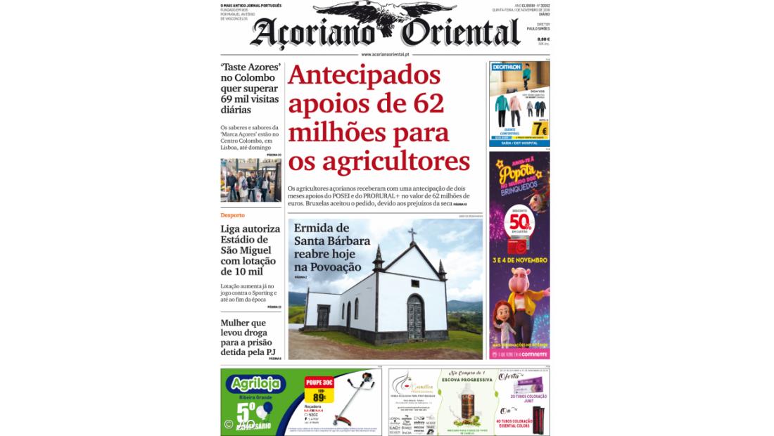 "Antecipados apoios de 62 milhões para os agricultores" é a manchete do Açoriano Oriental
