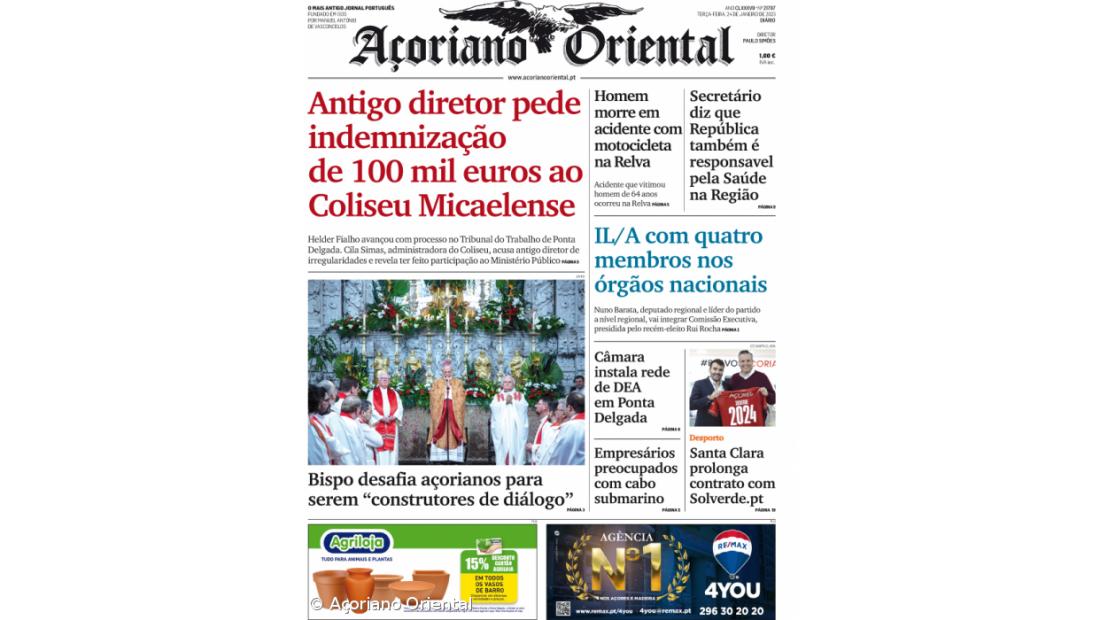"Antigo diretor pede indemnização de 100 mil euros ao Coliseu Micaelense" é a manchete de hoje