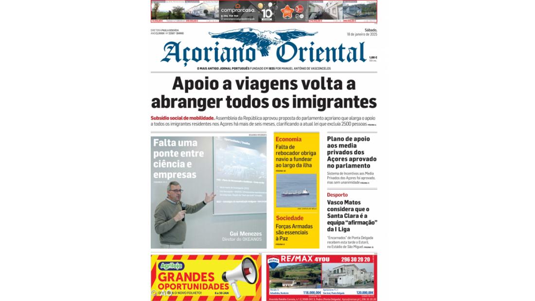 A aprovação na Assembleia da República da alteração ao subsídio social de mobilidade, que passa a ser alargado a todos os imigrantes que residam há mais de seis meses nos Açores, está em destaque no Açoriano Oriental de sábado, 18 de janeiro de 2025.