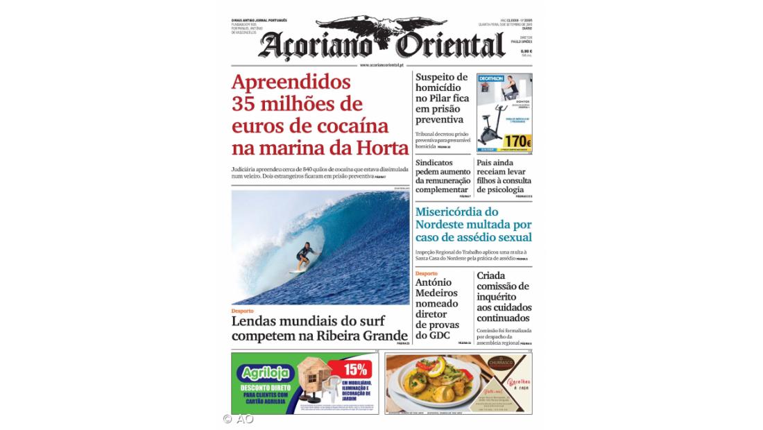 "Apreendidos 35 milhões de euros de cocaína na marina da Horta" é a manchete desta quarta-feira do Açoriano Oriental