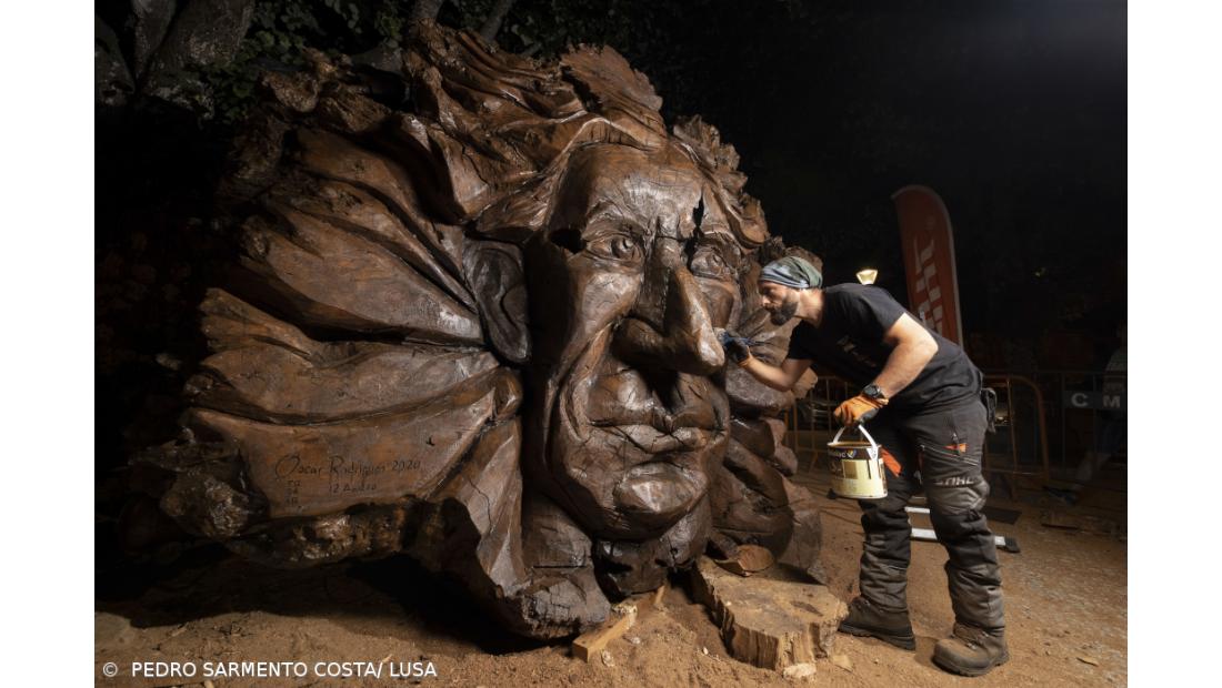 O trabalho foi feito ao vivo, na praça central de São Martinho de Anta, e é através de motosserras que Óscar Rodrigues, natural de Vila Pouca de Aguiar, dá forma à sua arte.