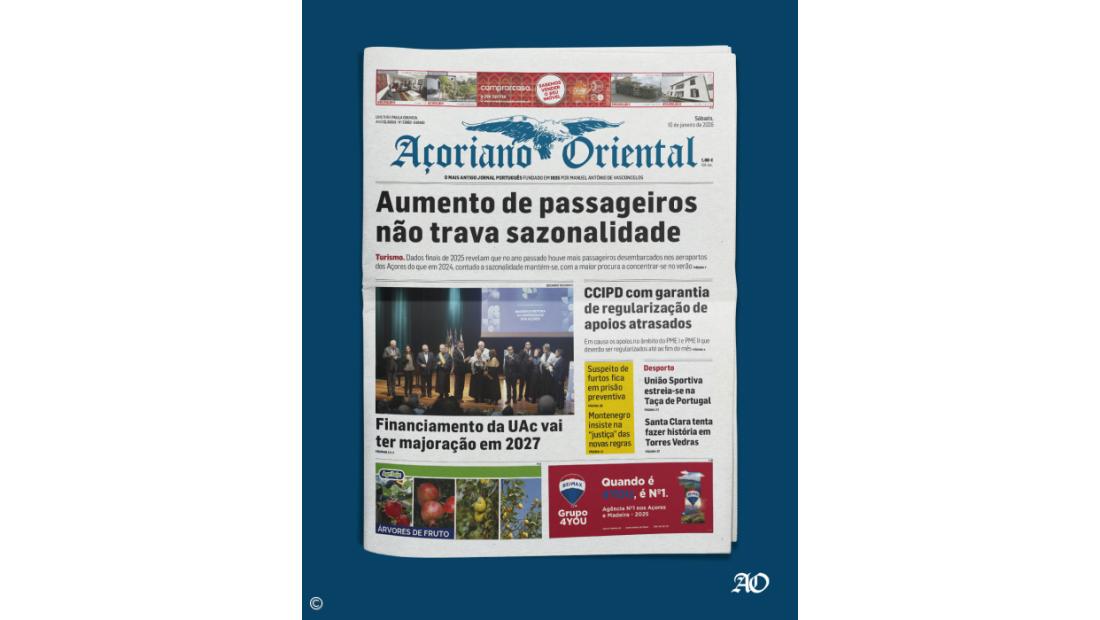 Ainda nesta edição: "Financiamento da UAc vai ter majoração em 2027", "CCIPD com garantia de regularização de apoios atrasado", "Suspeito de furtos fica em prisão preventiva" e "Montenegro insiste na “justiça” das novas regras".