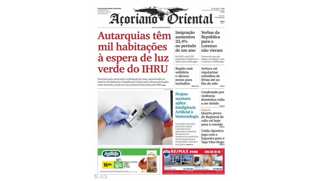 Nesta edição, o Açoriano Oriental dá conta ainda de um projeto inovador que aplica Inteligência Artificial à biotecnologia; e avança que não chegou ainda à Região verbas da República para prejuízos com Lorenzo e HDES; que a imigração aumentou 22,4% nos Açores num ano; que a Região está solidária e oferece meios para incêndios; e que Arrisca vai regularizar subsídios de férias até ao fim do mês.