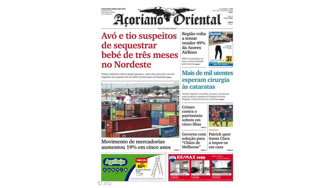 "Avó e tio suspeitos de sequestrar bebé de três meses no Nordeste" é a manchete do Açoriano Oriental