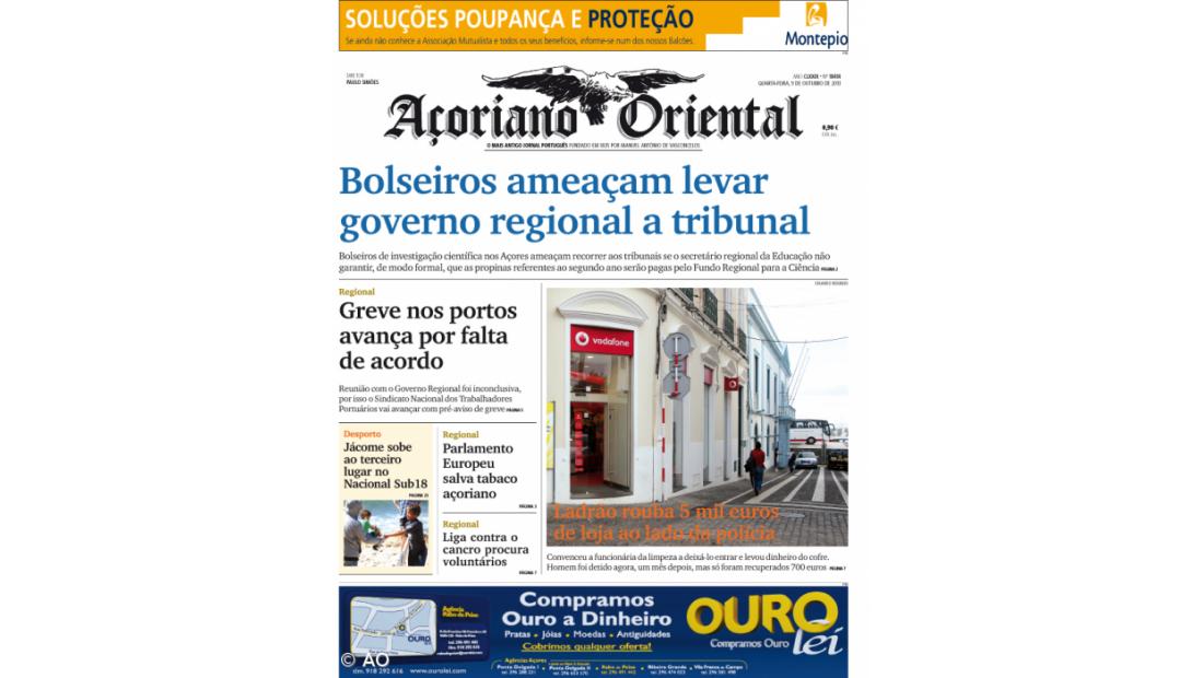 A ameaça de greve dos trabalhadores portuários é outro dos destaques da primeira página da edição de hoje, onde se dá lugar também ao apelo da Liga Portuguesa Contra o Cancro por novos voluntários e ao passo importante dado pelo Parlamento Europeu para evitar medida que colocaria em risco produção tabágica nos Açores.