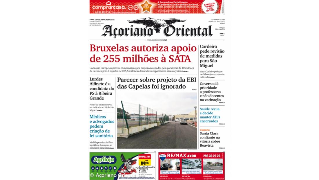 A manchete do Açoriano Oriental destaca que a Comissão Europeia aprovou uma compensação por prejuízos causados pela pandemia de 12 milhões de euros e apoio à liquidez de 255,5 milhões a favor da transportadora aérea açoriana.