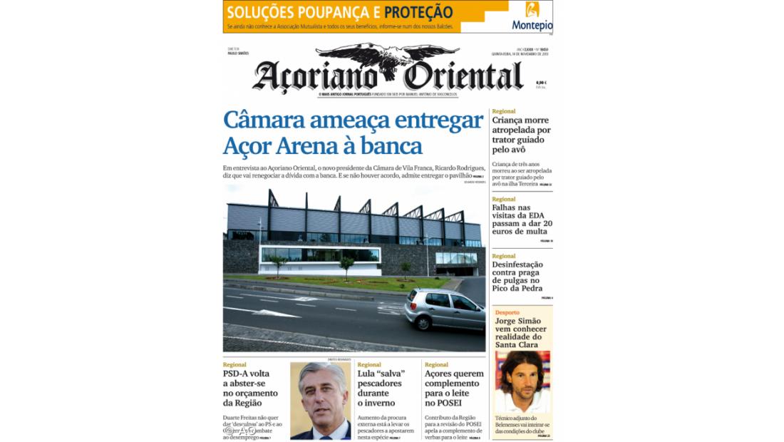 A entrevista com o novo presidente da Câmara Municipal de Vila Franca, Ricardo Rodrigues, onde este afirma que vai renegociar a dívida do pavilhão com a banca, está em destaque no Açoriano Oriental de quinta-feira, 14 de novembro de 2013.