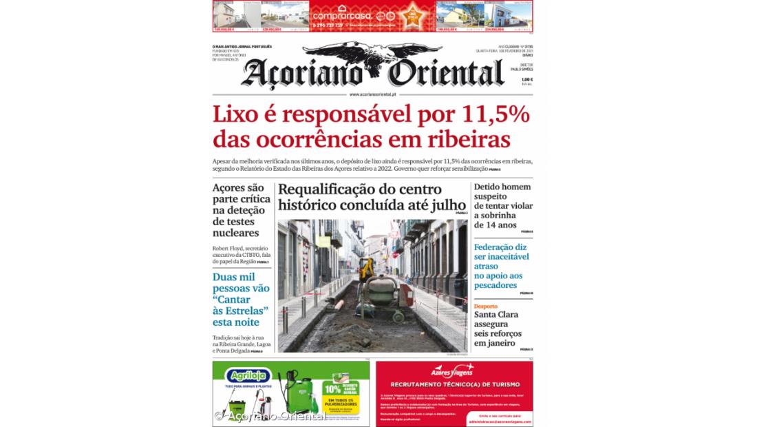 "Requalificação do centro histórico concluída até julho", "Açores são parte crítica na deteção de testes nucleares", "Duas mil pessoas vão 'Cantar às Estrelas' esta noite", "Detido homem suspeito de tentar violar a sobrinha de 14 anos", "Federação diz ser inaceitável atraso no apoio aos pescadores" e "Santa Clara assegura seis reforços em janeiro" são os restantes títulos da primeira página