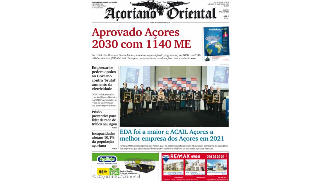 "EDA foi a maior e ACAIL Açores a melhor empresa dos Açores em 2021", "Empresários pedem apoios ao Governo contra 'brutal' aumento da eletricidade", "Prisão preventiva para líder de rede de tráfico na Lagoa", "Incapacidades afetam 10,1% da população açoriana" são as outras chamadas da primeira página