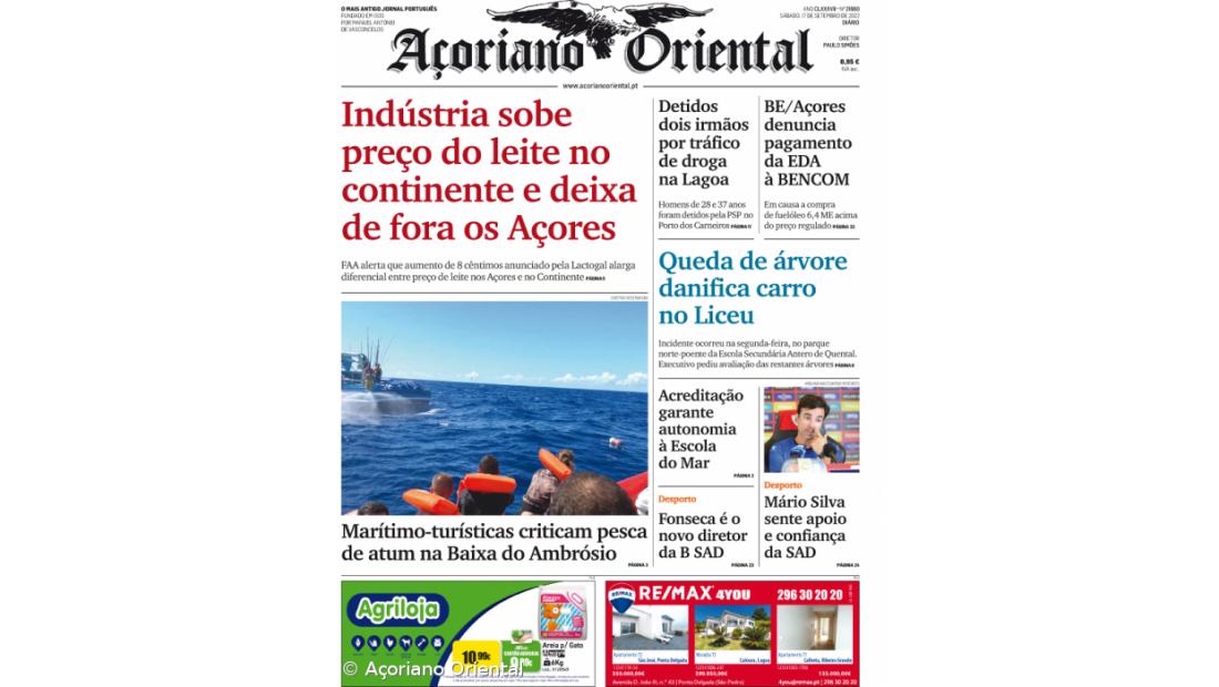 "Marítimo-turísticas criticam pesca de atum na Baixa do Ambrósio", "Detidos dois irmãos por tráfico de droga na Lagoa", "BE/Açores denuncia pagamento da EDA à BENCOM", "Queda de árvore danifica carro do Liceu", "Acreditação garante autonomia à Escola do Mar", "Fonseca é o novo diretor desportivo da B SAD" e "Mário Silva sente apoio e confiança da SAD" são os restantes títulos da edição de sábado.