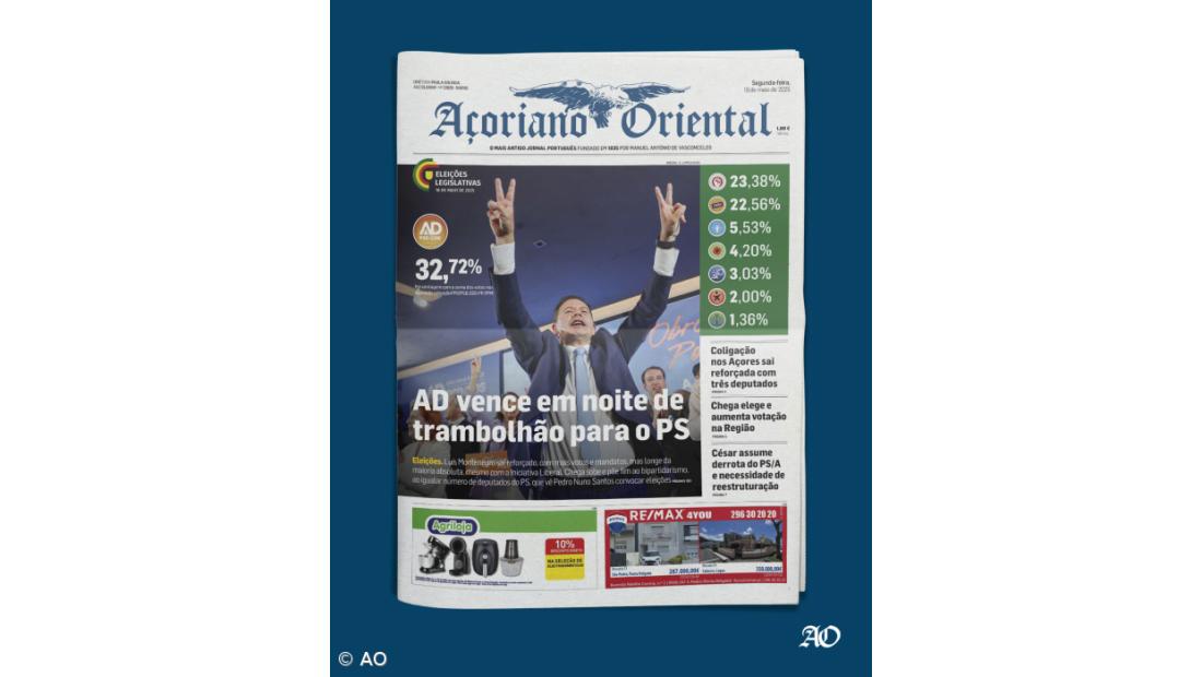 Capa AO 19 maio AD vence em noite de trambolhão para o PS, é a manchete desta segunda-feira 19 de mai. de 2025, 09:35 Autor: AO Online