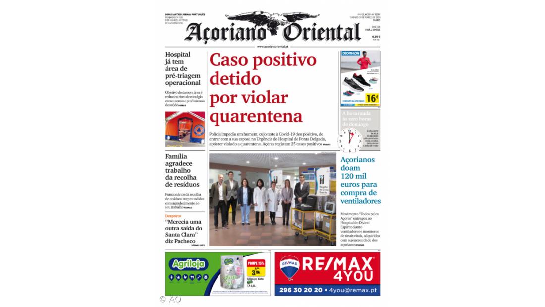 A detenção pela Polícia de um homem, cujo teste à Covid-19 deu positivo e que tentava entrar na Urgência do Hospital de Ponta Delgada, após violar a quarentena, está em destaque no Açoriano Oriental de sábado, 28 de março de 2020.