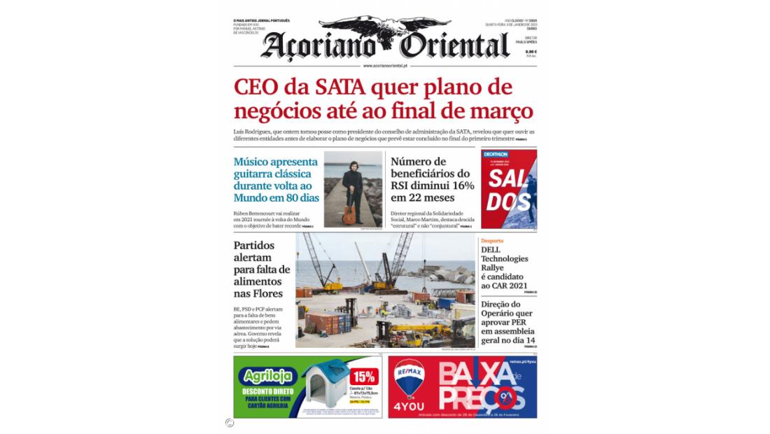 "Músico apresenta guitarra clássica durante volta ao Mundo em 80 dias", "Número de beneficiários do RSI diminui 16% em 22 meses" e "Partidos alertam para falta de alimentos nas Flores" são os outro títulos de capa do Açoriano Oriental.