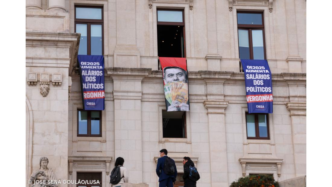 As faixas foram colocadas nas fachadas principal e lateral do edifício da Assembleia da República e também no chamado edifício novo do parlamento, estando penduradas em várias janelas, com a inscrição "OE2025 aumenta salários dos políticos. Vergonha".