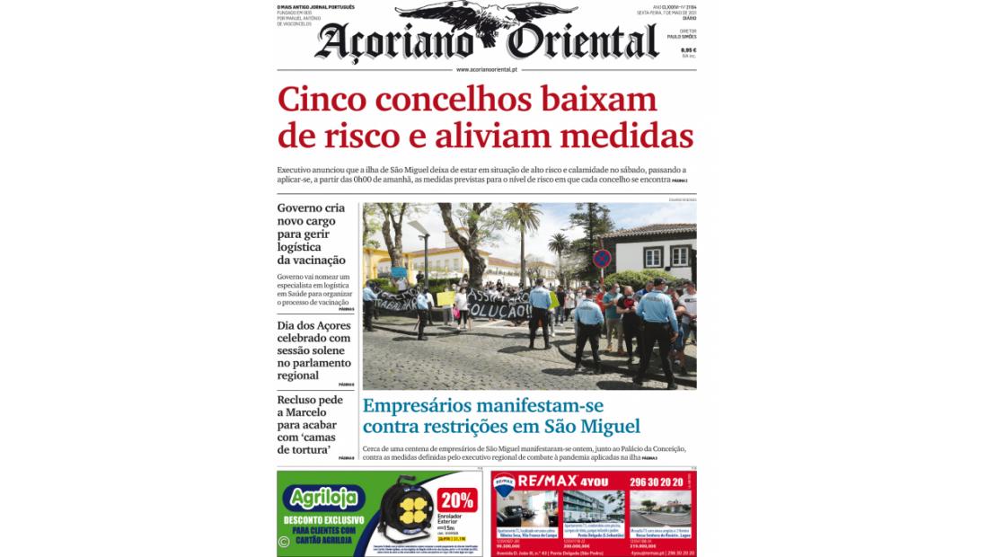 "Cinco concelhos baixam de risco e aliviam medidas" é a manchete desta sexta-feira do Açoriano Oriental.