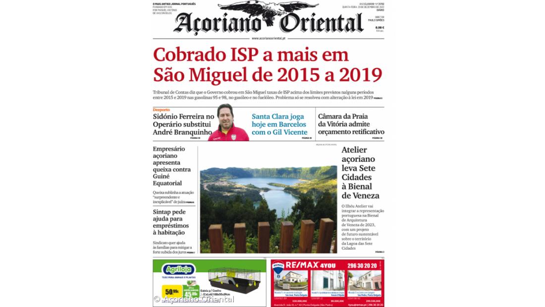 "Cobrado ISP a mais em São Miguel de 2015 a 2019" é a manchete do Açoriano Oriental