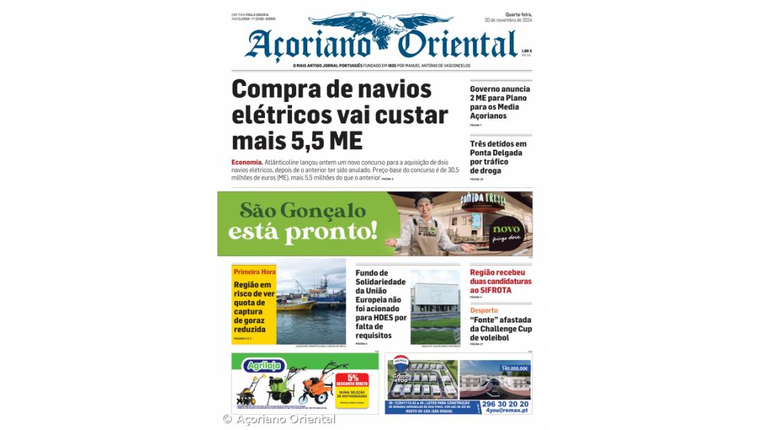 A manchete desta quarta-feira do jornal Açoriano Oriental revela que a Atlânticoline lançou um novo concurso para a aquisição de dois navios elétricos e que o preço base é, agora, de 30,5 milhões de euros, mais 5.5 milhões que o anterior