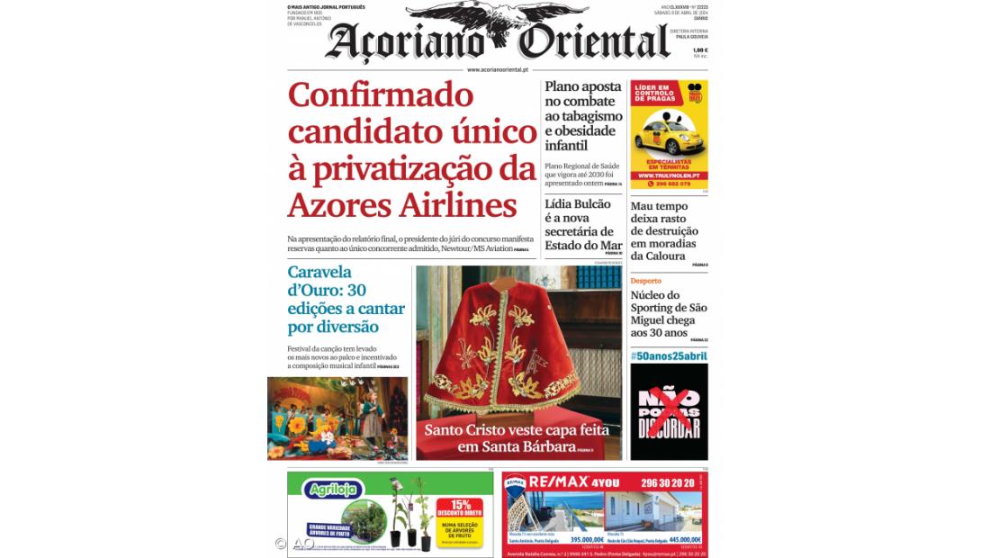 O relatório final do júri do concurso para a privatização da Azores Airlines está em destaque no Açoriano Oriental de sábado, 6 de abril de 2024.