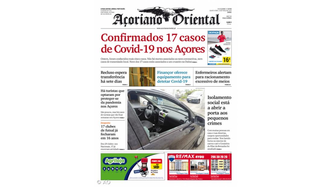"Confirmados 17 casos de Covid-19 nos Açores" é a manchete do Açoriano Oriental