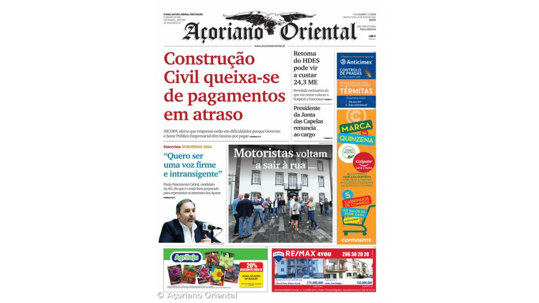 "Motoristas voltam a sair à rua" é o título da manchete fotográfica. "Retoma do HDES pode vir a custar 24,3 ME", "Presidente da Junta das Capelas renuncia ao cargo" e "Quero ser uma voz firme e intransigente", neste caso em alusão à entrevista concedida pelo candidato da AD às eleições europeias, Paulo Nascimento Cabral, são os restantes títulos de capa do Açoriano Oriental.