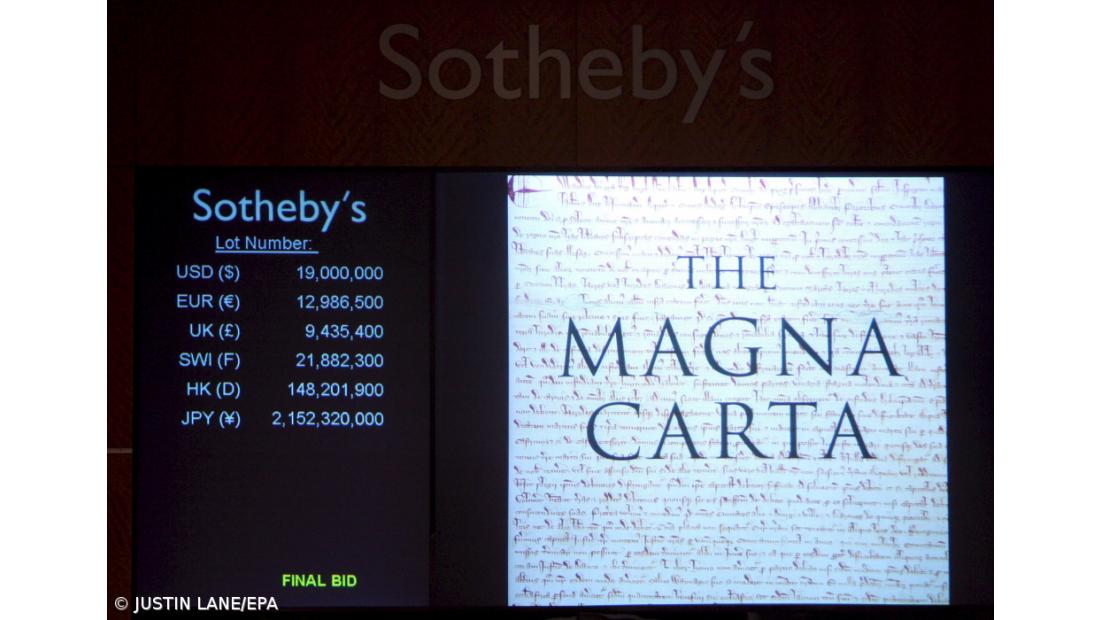Para David Redden, vice-presidente da Sotheby's, este manuscrito em pergaminho é "o documento mais importante do mundo", "o primeiro degrau na escada da liberdade" e "simboliza a busca eterna da liberdade pelo homem".