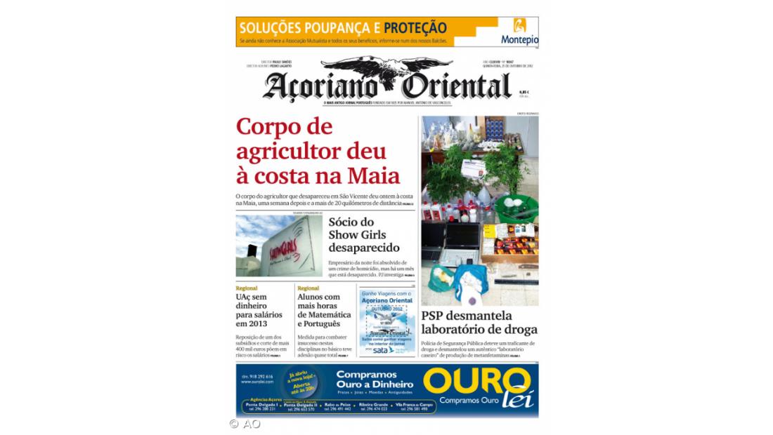 "Corpo de agricultor deu à costa na Maia" é a manchete do Açoriano Oriental