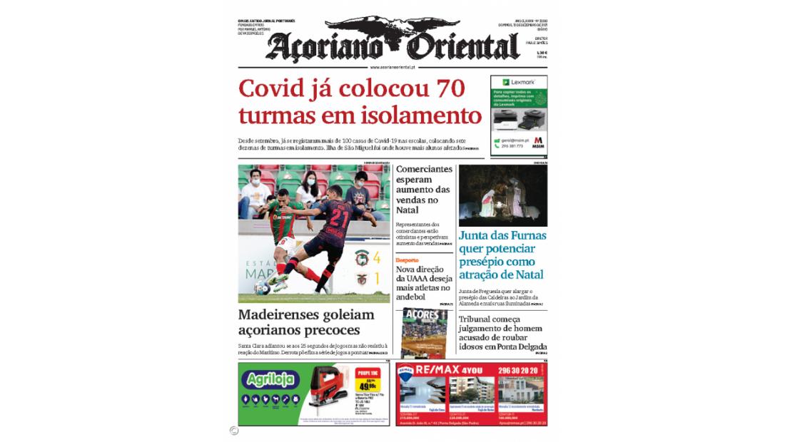 "Covid já colocou 70 turmas em isolamento" é a manchete da edição de domingo do Açoriano Oriental.