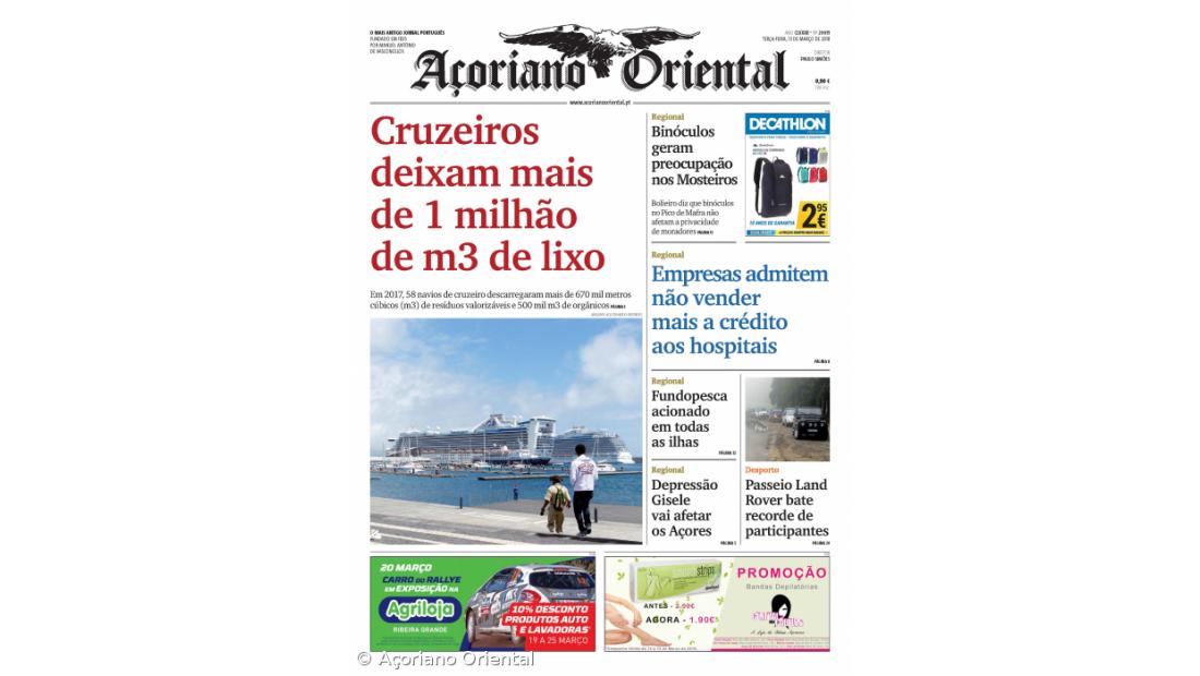 A manchete do Açoriano Oriental noticia, com destaque fotográfico, que no ano passado 58 navios de cruzeiro descarregaram mais de 670 mil metros cúbicos (m3) de resíduos valorizáveis e 500 mil m3 de orgânicos.
