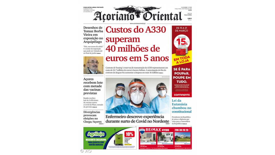 "Enfermeiro descreve experiência durante surto de Covid no Nordeste", é o título do destaque fotográfico da capa do Açoriano Oriental.