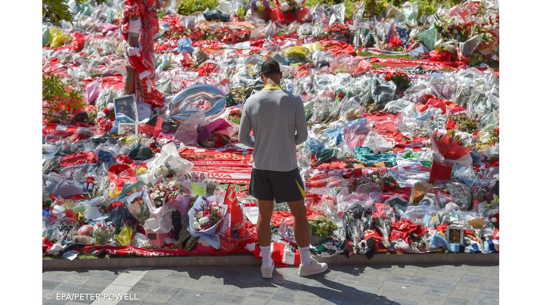 Dalot carregou a coroa de flores com a inscrição “Descansem em paz, Diogo e André. Com as mais sinceras condolências de todos do Manchester United” e depositou-a no longo tapete de lembranças deixadas num memorial junto ao estádio do Liverpool.