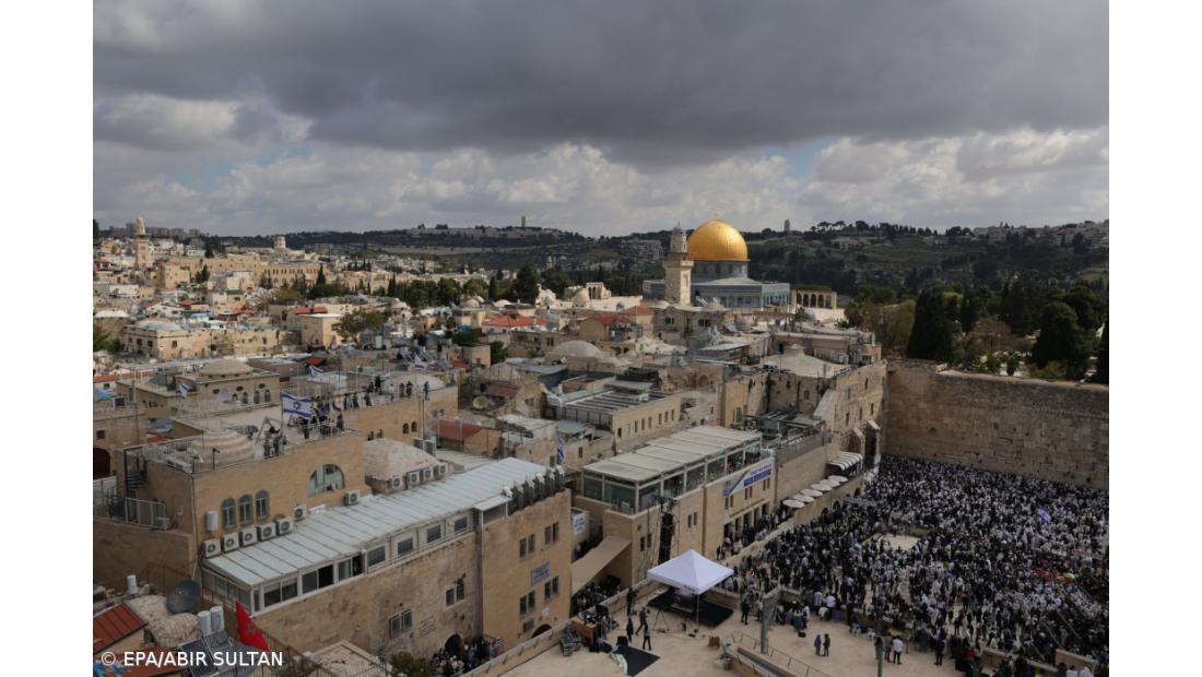 A bênção é recitada em hebraico, enquanto os líderes religiosos cobrem a cabeça com xales de oração, criando um mar branco na Praça do Muro Ocidental.